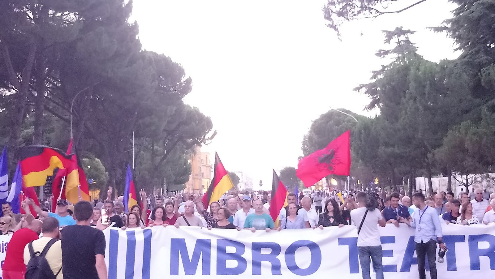 Por isso mesmo, a oposição tem-se manifestado não somente com as bandeiras da Albânia mas também com as da UE, Estados Unidos e Alemanha, para realçar o seu sentimento pró-ocidente. As eleições municipais de fins de Junho foram boicotadas e só o Partido Socialista é que participou. As manifestações na rua, muito concorridas, sobretudo em Tirana, tanto têm sido pacíficas como têm alguns picos de violência, como aconteceu em Maio. Além das bandeiras, exibem-se cartazes apelando à demissão do governo, com imagens comparando Rama a Enver Hoxha ou colocando-o entre os líderes comunistas clássicos. Basha, o líder da oposição, costuma liderar estes movimentos e discursar aos manifestantes. Têm como grito de guerra "Rama Ik (fora, ou sai)", clamado até à exaustão exigindo a demissão do governo, que acusam de ser ilegítimo, e a convocação de novas eleições. Mas Rama não cede, acusa a oposição de conspirar e de produzir calúnias contra ele, e usa as suas armas, como a de que em alguns relatórios da UE consideraram o sistema judicial albanês, com inúmeros juízes colocados pelo Partido Democrático, altamente corrupto e viciado.