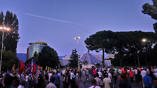 (Em cima, uma amostra das manifestações correntes em Tirana, onde são visíveis bandeiras da UE, dos EUA e da Alemanha, além das da própria Albânia e do Partido Democrático, cujo líder discursa num palanque).
