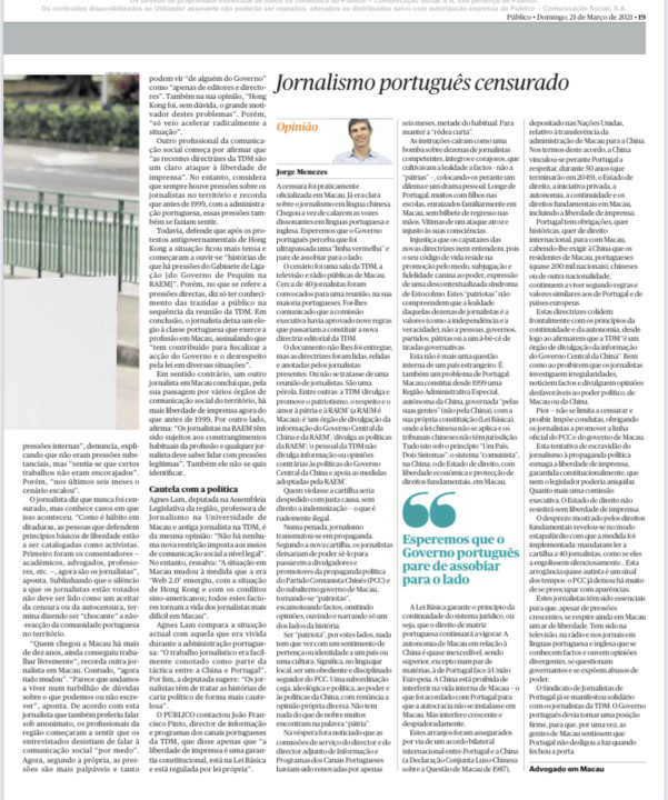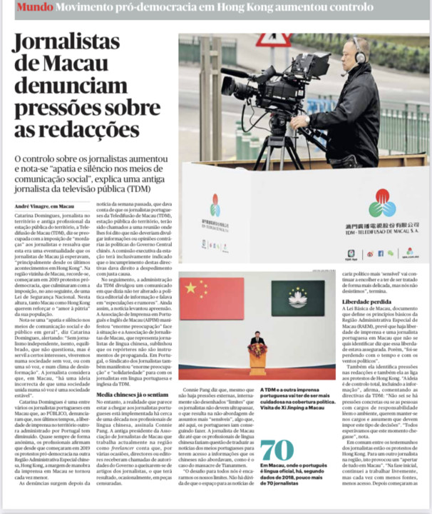 De salientar é, ainda, a coragem da Associação de Jornalistas de Macau, que congrega os profissionais de língua chinesa, que veio dizer não serem os jornalistas "meros instrumentos de propaganda dos meios políticos", deste modo marcando assinalável contraste com o comprometido silêncio das autoridades portuguesas com responsabilidades sobre Macau e dos dirigentes dos partidos políticos com assento parlamentar que estão habituados a excursionar com todas as mordomias pelo Império do Meio.