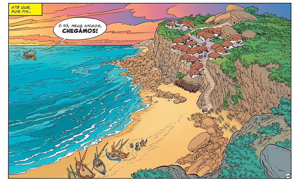 Agora, finalmente (!), na 41ª aventura vem à Lusitânia. Alguns dizem que pouco a esmiúça. Sim, de facto apenas a Gália é vasculhada ao longo da série, numa glosa dos manuais escolares e patrióticos de então. Tenho cá em casa, herdado, o Le Tour de France par Deux Enfants, de G. Bruno (1913), depósito do que fora a visão da França (Gália) querida como verdadeira. Algures li que foi matéria-prima para o A Volta à Gália e tantos outros álbuns. Mas para nenhuma das outras excursões internacionais teve Astérix tantos guias Michelin (ou Lonely Planet) …