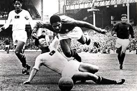 Eusébio travado em falta na jogada mais emocionante do Portugal-Coreia do Norte (1966): ainda não hava cartões vermelhos