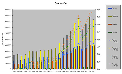 Fontes: Organização Mundial do Comércio para os dados relativos às exportações, Fundo Monetário Internacional (World Economic Outlook Database, Outubro de 2013) para os restantes.