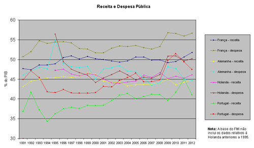 (Clicar nas imagens - e depois uma segunda vez - para aceder a versões maiores. O ano de 1991 foi escolhido para permitir obter um retrato da situação na época imediatamente após a reunificação alemã. A Base do FMI não inclui os dados da despesa e da dívida da Holanda para os anos anteriores a 1995.)