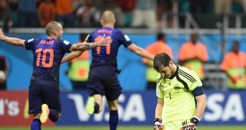 Os holandeses jogaram com um sistema excelente para enfrentar a Espanha. Com a Espanha a depender exclusivamente dos laterais para darem largura ao jogo e com os dois médios "ala" a cortarem para dentro, os laterais holandeses puderam subir e enfrentar Azpilicueta e Alba cedo, negando-lhes o espaço para poderem ganhar velocidade. Isto abriu algum espaço junto às laterais que Diego Costa foi utilizando inicialmente (o penalty nasce de um movimento desses) mas apenas até os holandeses se adaptarem a essas movimentações. A solução espanhola teria sido fazer entrar Pedro e - na ausência de Juan Mata - Cazorla, mais cedo para dar largura ao jogo e esticar a defesa holandesa. Não o fizeram e apenas congestionaram o centro do terreno. Sem a capacidade de outrora, não se deram bem com a ausência de espaços e com a defesa musculada dos holandeses.