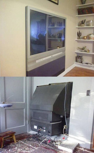Pegue naquela obsoleta aparelhagem baratucha e surpreenda os seus amigos com um invejável equipamento áudio-visual de primeiríssima classe estrategicamente embutido na parede principal da sua sala.