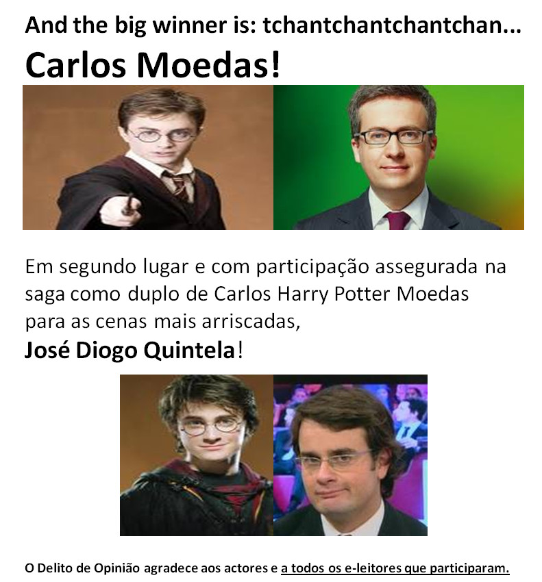 Nota 2: Esta é a última oportunidade para os nossos leitores sugerirem candidatos ao papel de Harry Potter nacional. O actor será escolhido por votação, em moldes ainda a determinar. Tal como o governo em relação à redução da despesa, sabemos que a vamos fazer, mas ainda não sabemos como. Em todo o caso, pelo nosso lado, está posto de parte o lançamento de novos (actores) impostos.